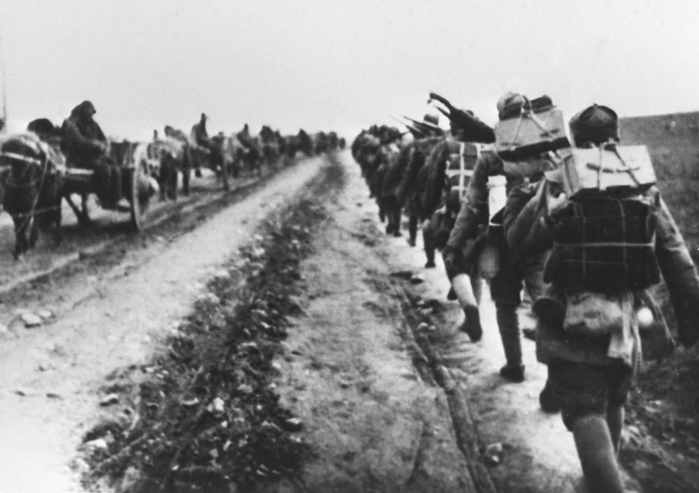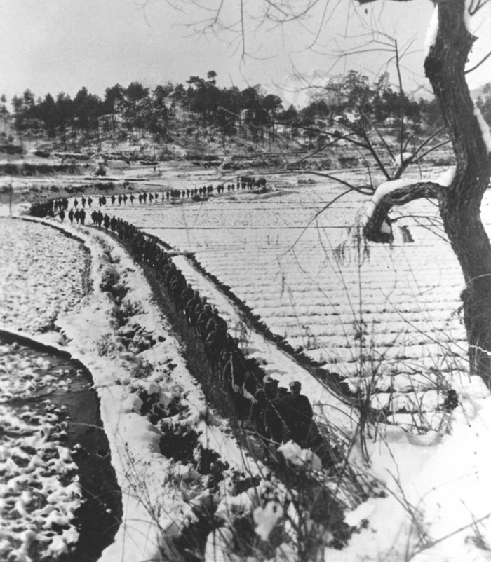 ↑ 抗日戰爭期間,新四軍在蘇北冰天雪地中行進。