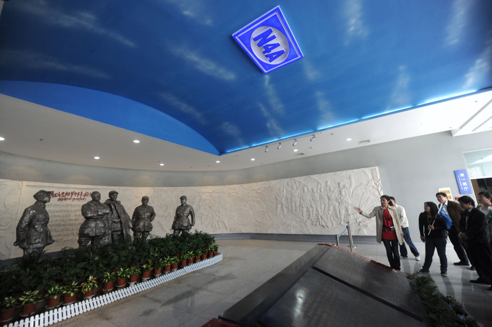 ↑ 在鹽城新四軍紀念館,講解員在向觀眾介紹展廳入口處的浮雕和塑像(2011年5月27日攝)。