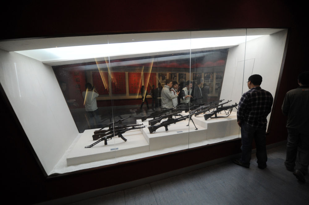 ↑ 觀眾在鹽城新四軍紀念館內參觀槍支等實物展品(2011年5月26日攝)。