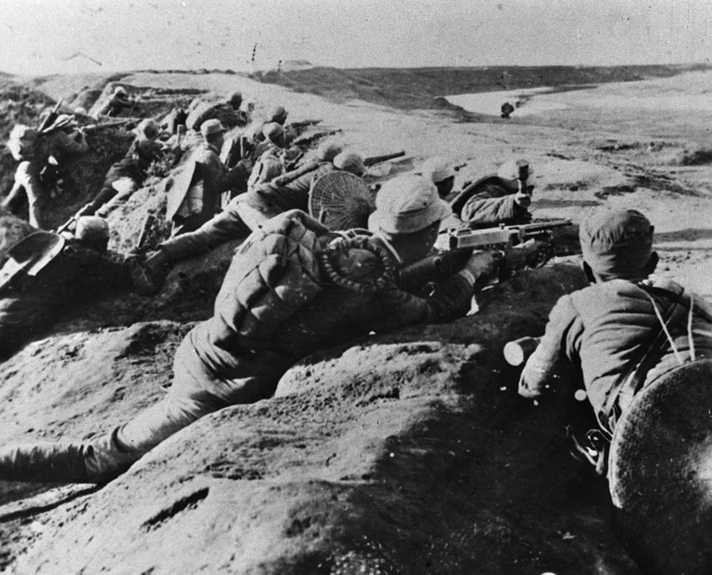 ↑ 新四軍戰士在馬家園戰斗中射擊敵人。