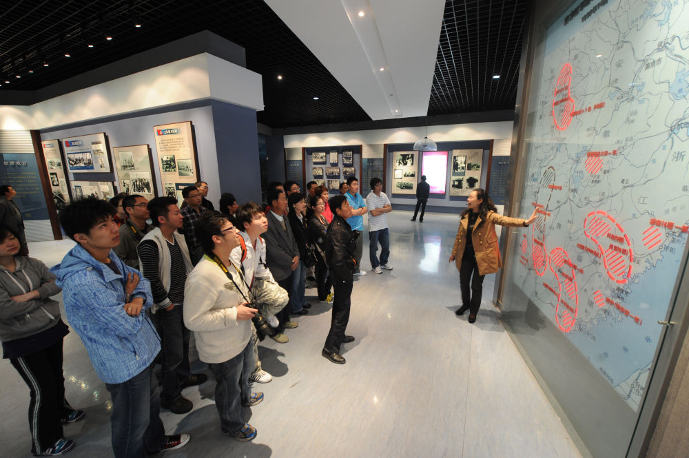 ↑ 在鹽城新四軍紀念館內,講解員在向觀眾介紹南方紅軍游擊隊整編為新四軍示意圖(2011年5月26日攝)。