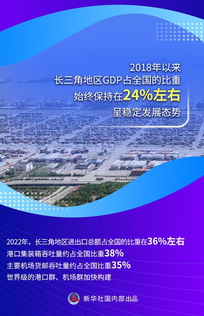 2022年,長三角地區進出口總額占全國的比重在36%左右,港口集裝箱吞吐量約占全國比重38%,主要機場貨郵吞吐量約占全國比重35%,世界級的港口群、機場群加快構建。