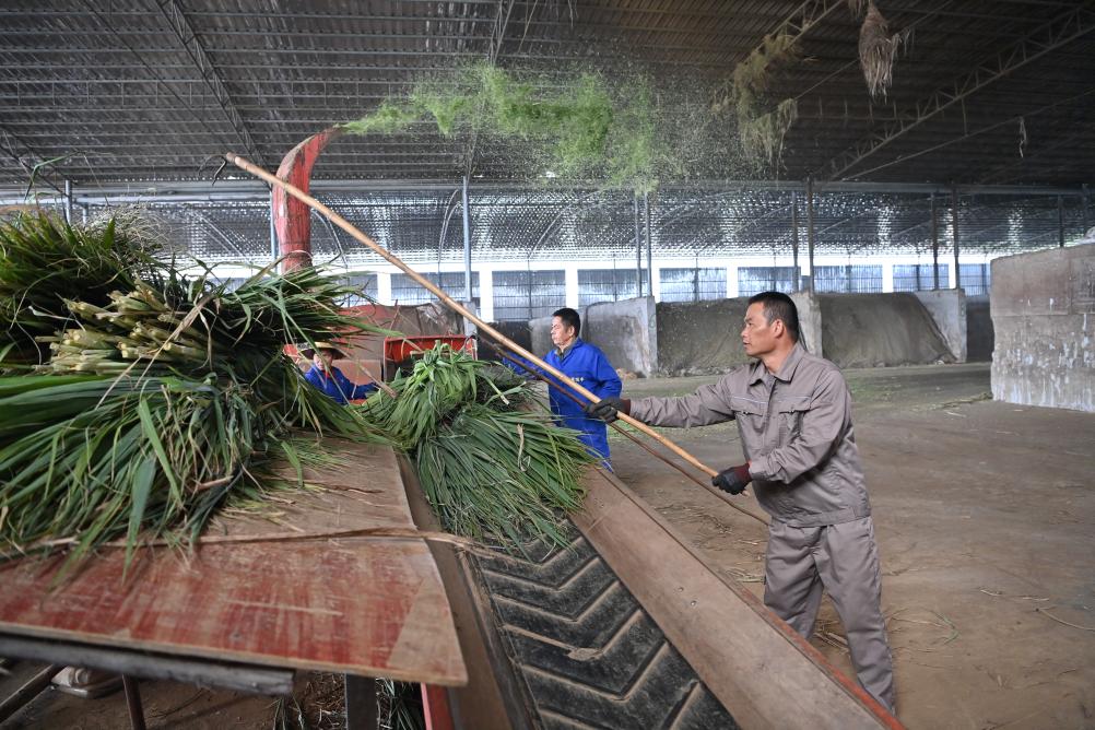 近日,在廣西來賓市一家養牛場,工作人員正將甘蔗尾梢加工成飼料。 新華社記者 周華 攝