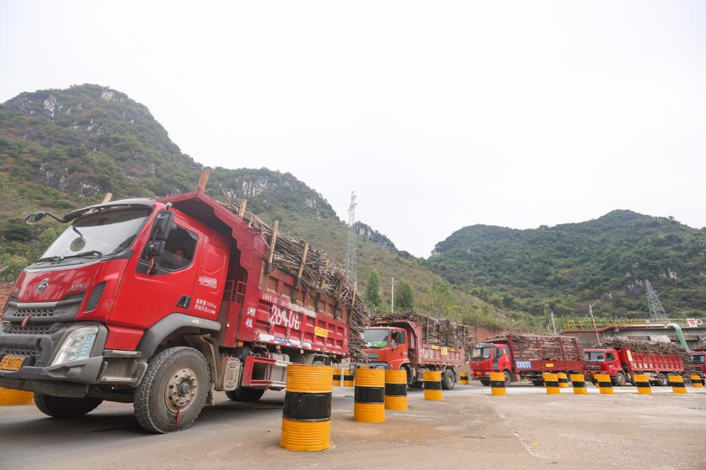 近日,在廣西來賓市一糖廠,裝滿甘蔗的車輛正排隊入廠。新華社記者 胡星宇 攝