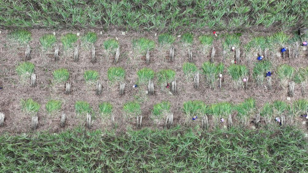 近日,無人機拍攝的廣西來賓市興賓區蔗農正在砍收甘蔗。 新華社記者 周華 攝