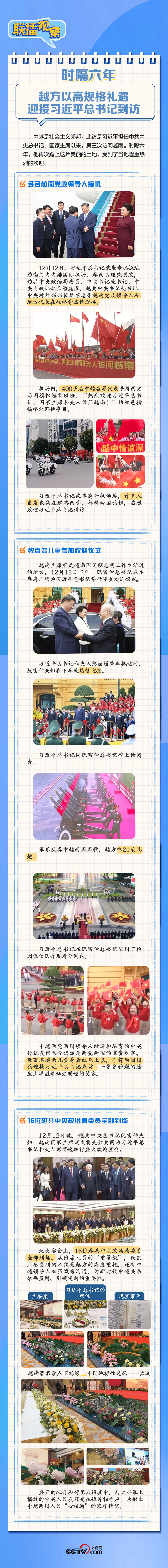 多名越南黨政領(lǐng)導(dǎo)人接機(jī)、中越各界代表手持兩黨兩國旗幟夾道歡迎、16位越共中央政治局委員全部到場(chǎng)參加歡迎宴會(huì)……訪越期間,習(xí)近平總書記受到越方高規(guī)格熱情接待,點(diǎn)滴細(xì)節(jié)見證兩國“同志加兄弟”情誼。