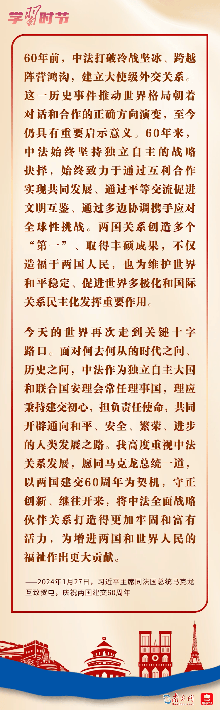 1月27日,國家主席習近平同法國總統馬克龍互致賀電,慶祝兩國建交60周年。習近平主席指出,60年前,中法打破冷戰堅冰、跨越陣營鴻溝,建立大使級外交關系。兩國關系創造多個“第一”、取得豐碩成果,不僅造福于兩國人民,也為維護世界和平穩定、促進世界多極化和國際關系民主化發揮重要作用。