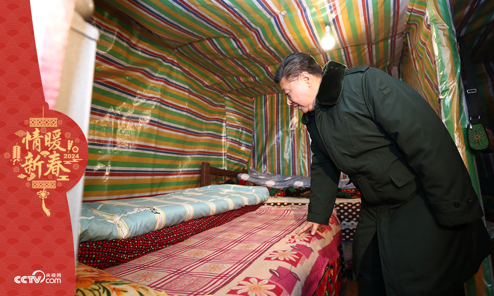 在貧困戶吉好也求家的土坯房里,總書記彎下腰,關切地掀開床褥、摸摸被子,看看夠不夠厚實。