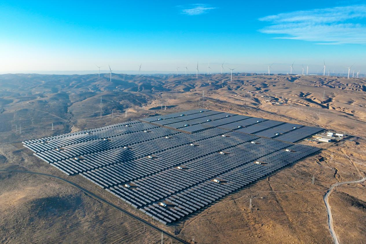 △ 2024年1月3日,寧夏銀川,俯瞰靈武市境內的“沙戈荒”光伏基地,一塊塊藍色光伏板源源不斷地輸送著綠色電能。
