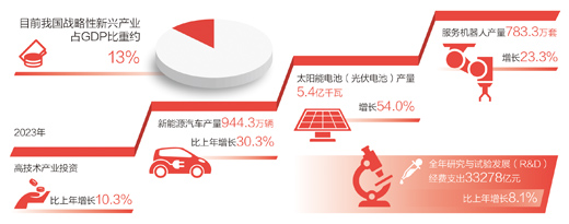 “發展新質生產力,既有利于培育發展一批產業規模大、帶動能力強的支柱產業,也有利于加快傳統產業轉型升級,增強我國經濟發展韌性,推動經濟實現質的有效提升和量的合理增長。”中山大學黨委副書記、校長高松代表說。2023年,我國高技術制造業增加值增長2.7%,高技術產業投資比上年增長10.3%,新動能不斷積蓄。