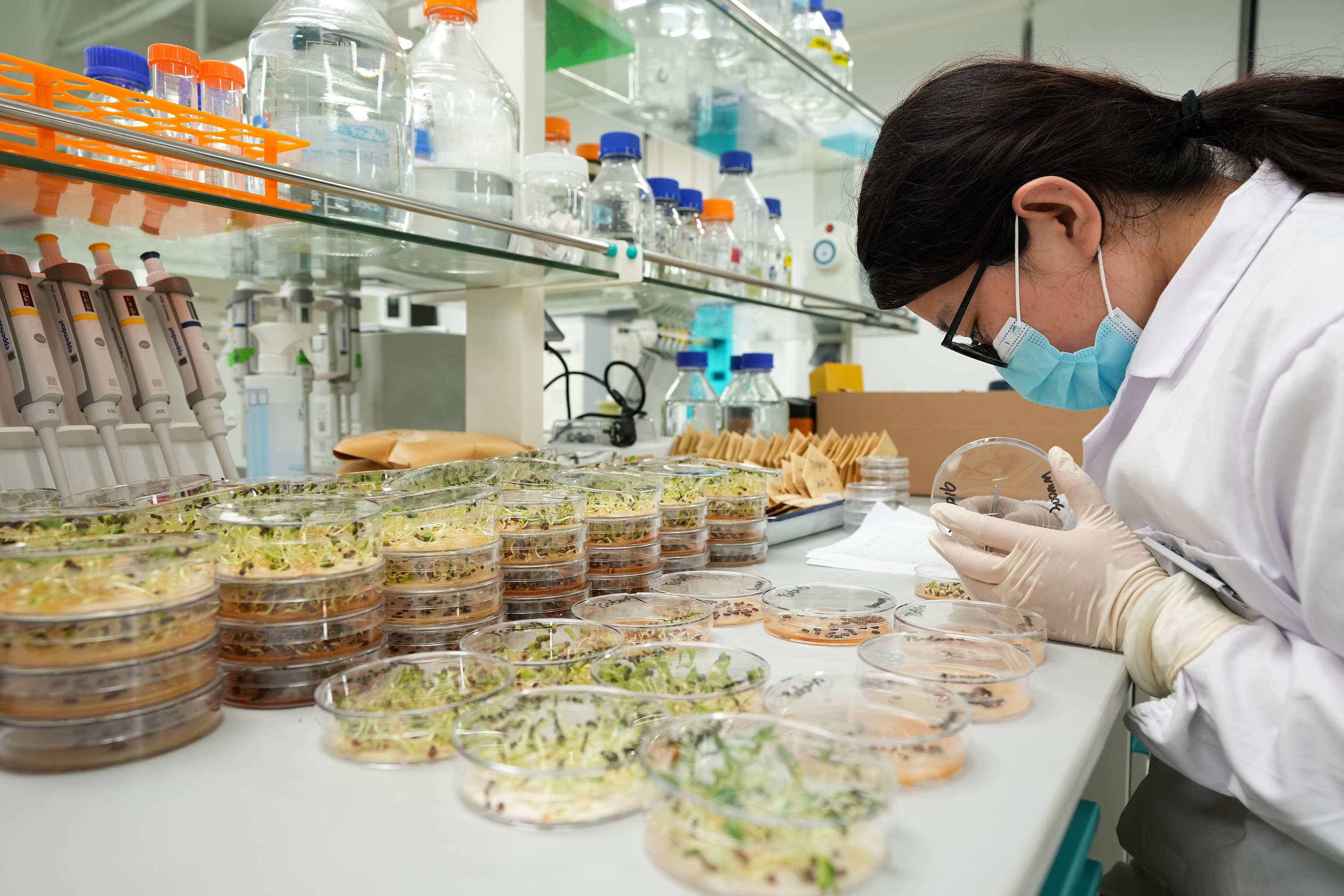 △ 海南三亞崖州灣科技城的崖州灣種子實驗室,科研人員正在觀察種子樣本。