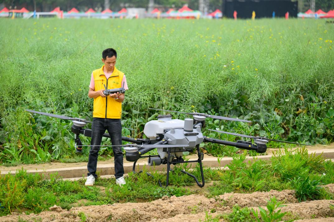 △ 2024年3月18日,廣東省東莞市石碣鎮掀起春耕生產熱潮。圖為一名工作人員正在操作無人機。