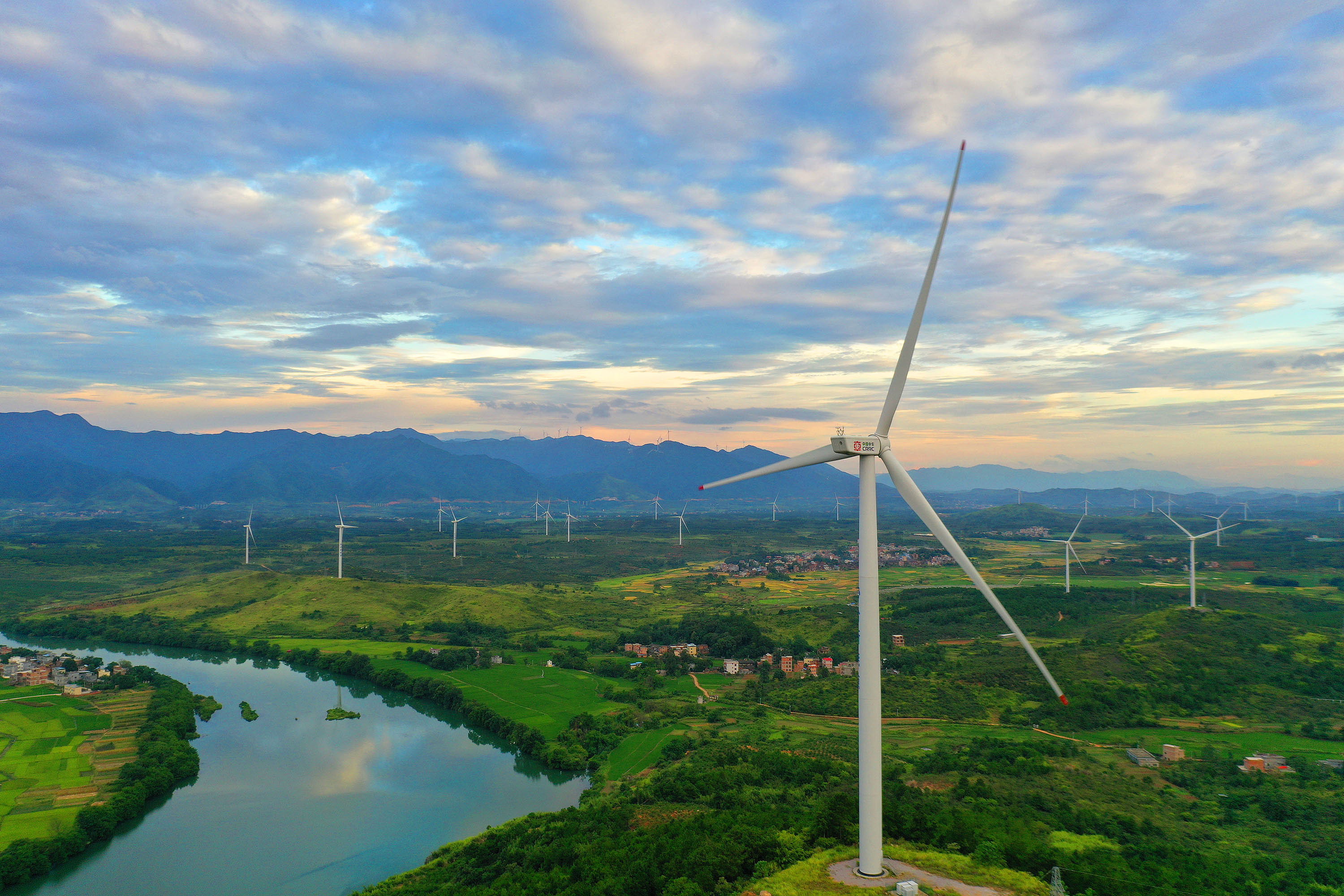 △ 湖南省永州市的風力發電風車與藍天、綠水、田野交相輝映,構成一幅美麗的生態畫卷。