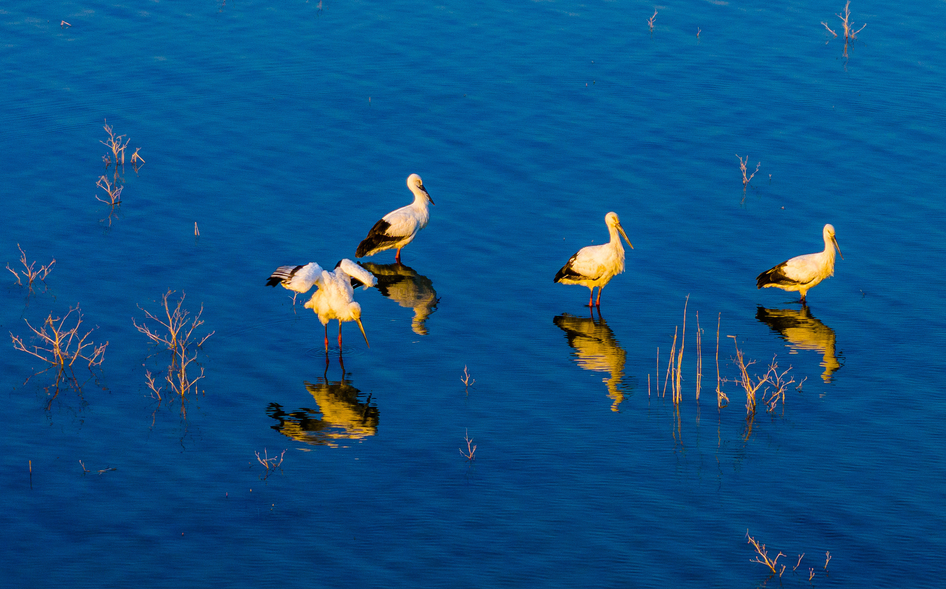 △ 2023年12月1日,安徽淮北,烈山區化家湖,4只遷徙的國寶級野生動物東方白鸛在休憩、覓食。