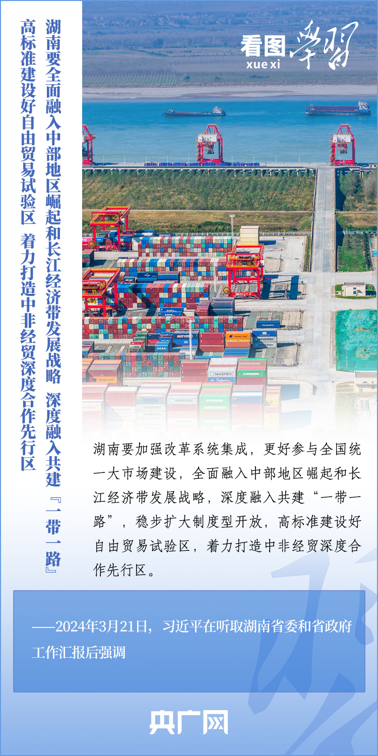 3月18日至21日,習近平總書記考察湖南長沙、常德等地,深入學校、企業、歷史文化街區、鄉村等進行調研。總書記強調,湖南要牢牢把握自身在構建新發展格局中的戰略定位,堅持穩中求進工作總基調,堅持高質量發展不動搖,堅持改革創新、求真務實,在打造國家重要先進制造業高地、具有核心競爭力的科技創新高地、內陸地區改革開放高地上持續用力,在推動中部地區崛起和長江經濟帶發展中奮勇爭先,奮力譜寫中國式現代化湖南篇章。一起來學習!