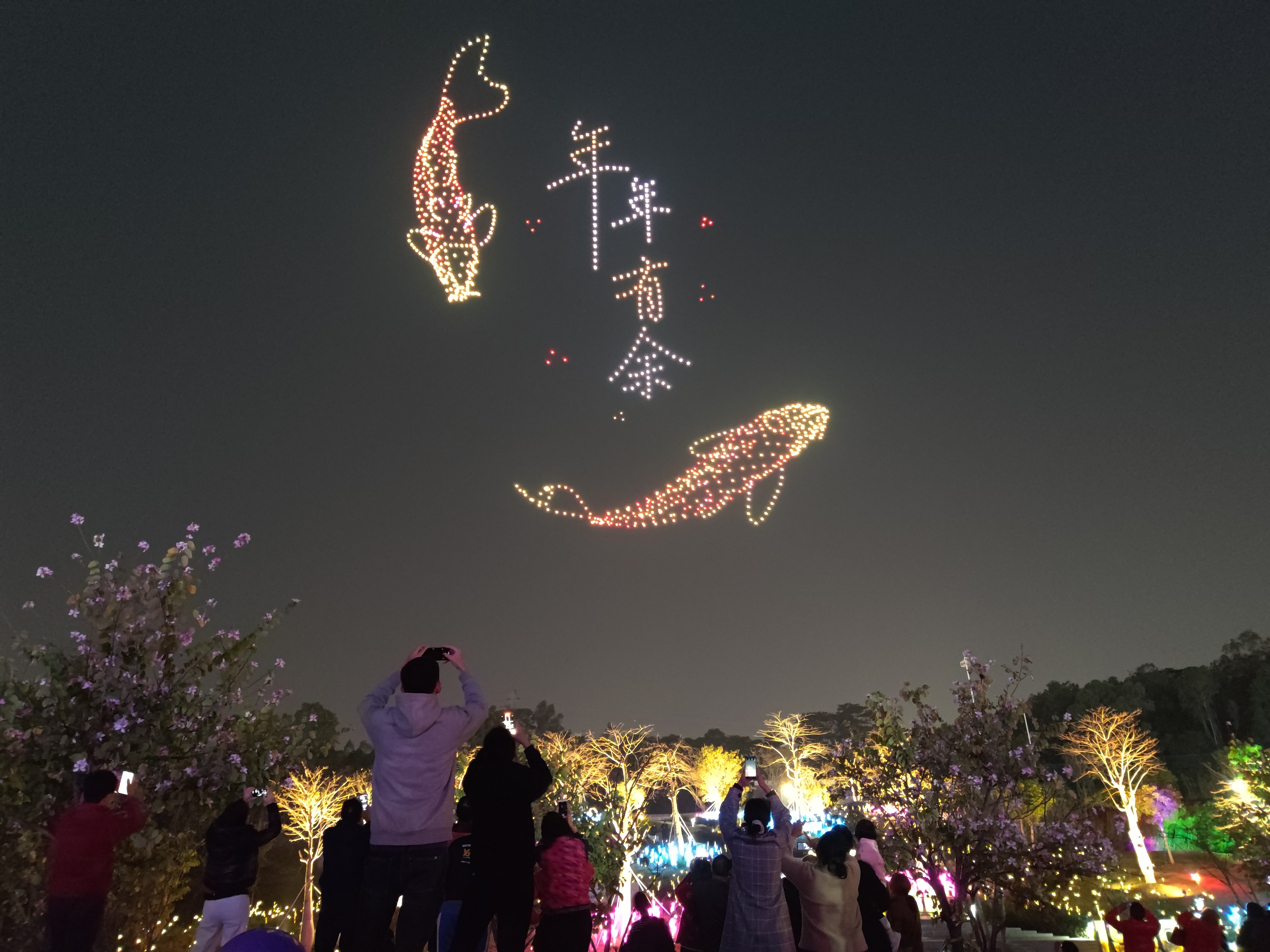 △ 2024年2月10日,深圳北站中心公園,春節(jié)主題無人機(jī)燈光秀引來眾多游客駐足觀看。