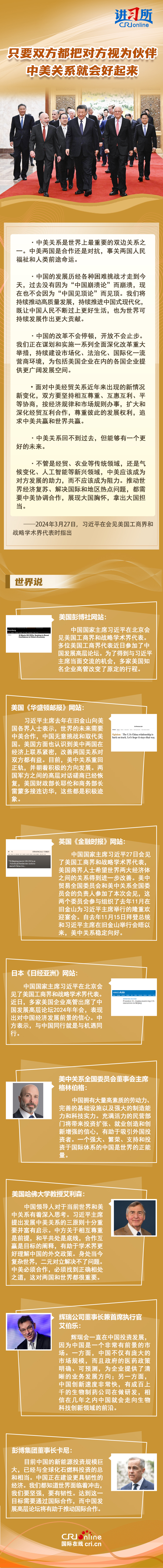3月27日,習近平主席在北京人民大會堂集體會見美國工商界和戰略學術界代表。習近平主席認真聽取了美方代表發言,對他們關心的問題一一作出回應,深刻闡明中國的發展前景和戰略意圖,深入闡釋中方發展對美關系的立場主張,指出只要雙方都把對方視為伙伴,相互尊重、和平共處、合作共贏,中美關系就會好起來。這充分表明中國作為負責任大國,堅持以人類前途為懷、以人民福祉為念,真誠希望中美關系穩下來、好起來,為世界和平發展注入正能量。