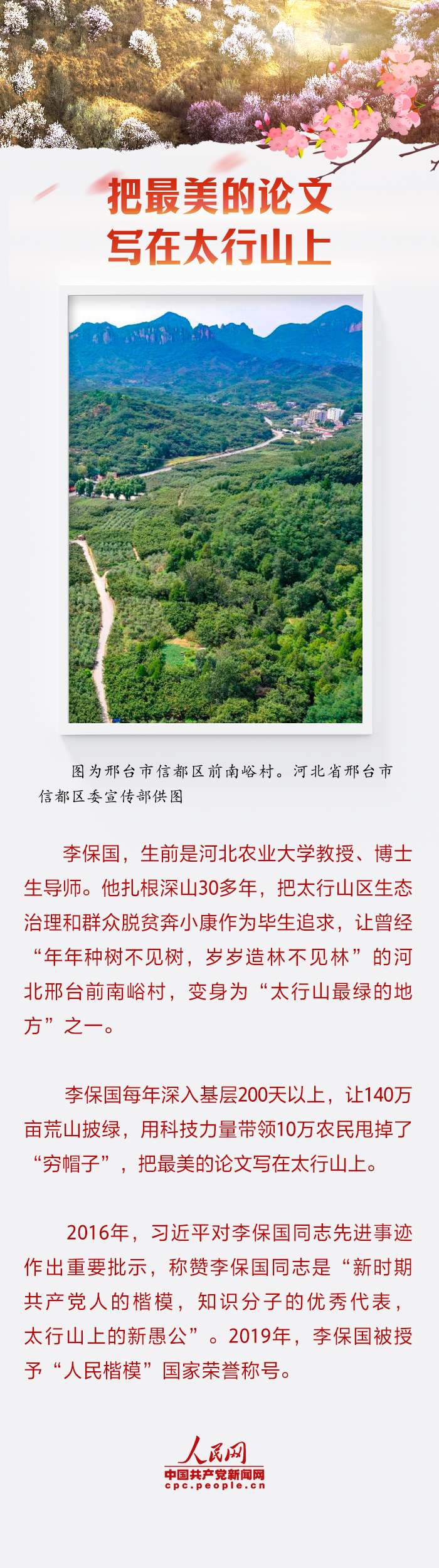 習近平總書記連續(xù)十多年履行與春天的“綠色約定”,心系國土綠化事業(yè),引領推進生態(tài)文明建設。“抓生態(tài)文明建設,既要靠物質,也要靠精神。”習近平總書記曾多次提到英模厚植精神之“樹”為人民謀幸福的事跡,一起學習領悟。