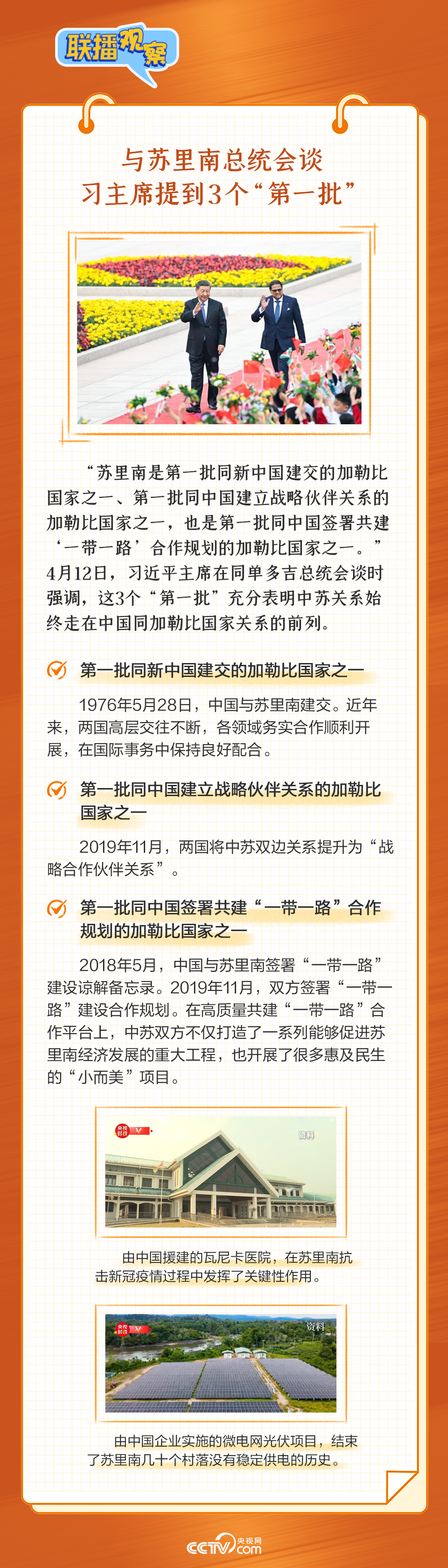 4月12日下午,習(xí)近平主席在北京人民大會堂同來華進(jìn)行國事訪問的蘇里南總統(tǒng)單多吉舉行會談。此前,外交部發(fā)言人曾表示,2024年是中國同蘇里南建立戰(zhàn)略合作伙伴關(guān)系5周年,中方歡迎單多吉總統(tǒng)在這一特殊時刻訪華。