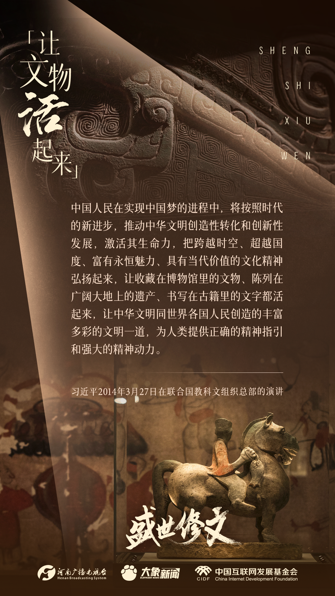 河南廣播電視臺大象新聞大型融媒體報道《盛世修文》,深入闡釋習近平文化思想,著力推進黨的創新理論飛入尋常百姓家。