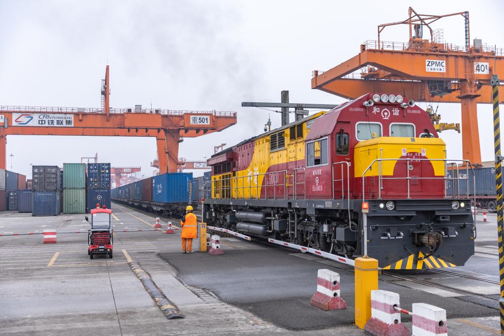 ??3月7日,一列滿載機械設備、整車及零部件等貨物的中歐班列在重慶團結村中心站等候發車。新華社記者 黃偉 攝