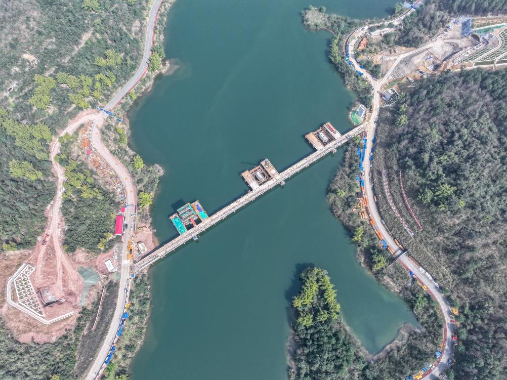 ??這是2月19日拍攝的位于重慶市銅梁區的成渝中線高鐵玄天湖大橋建設現場(無人機照片)。新華社記者 唐奕 攝