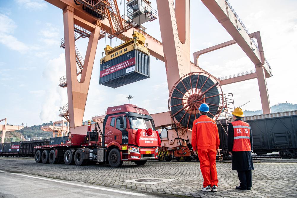 ??1月4日,在重慶萬州新田港站,工作人員進行集裝箱吊裝作業,將專列貨物轉運至公路物流環節。新華社記者 唐奕 攝