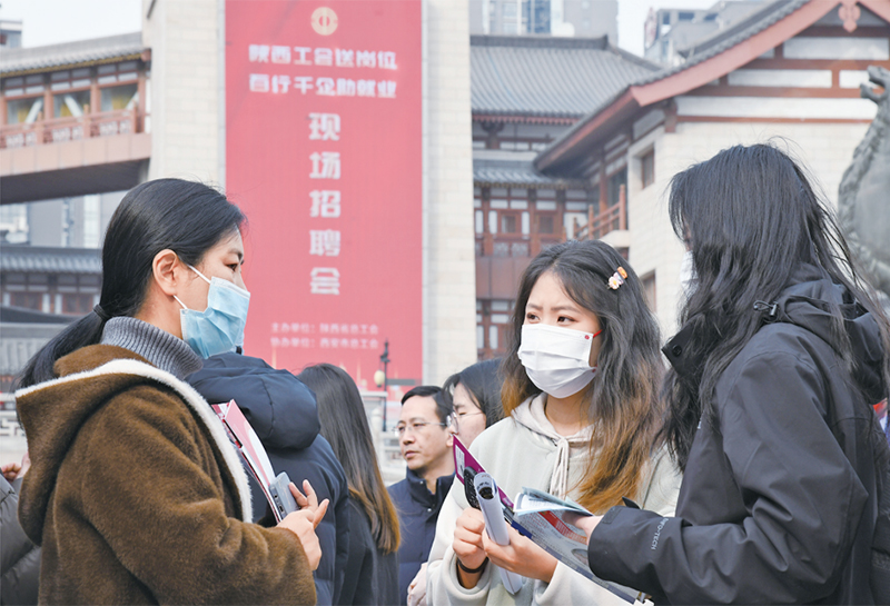 2024年3月6日,由陜西省總工會舉辦的2024年陜西工會“春送崗位”就業服務月啟動儀式在西安舉行。與啟動儀式同期舉辦的現場招聘會吸引約200家用人單位參加,提供崗位超過5000個。圖為當日求職者在現場招聘會上與企業工作人員交流。 新華社記者 張博文/攝