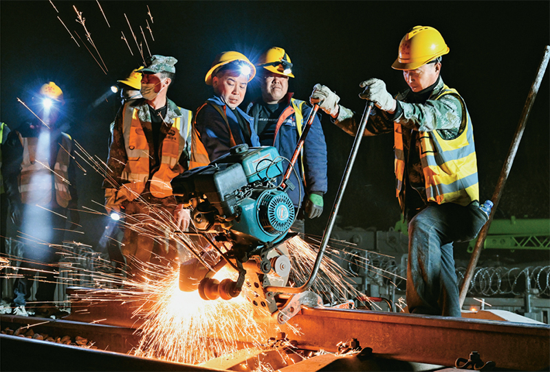 2024年4月10日,在內蒙古包頭市,包銀高鐵引入包頭樞紐工程的關鍵控制性工程之一——包西上行線路撥接完成施工。此次施工完成,標志著包銀高鐵引入包頭樞紐包頭站改造工程取得重大進展,為包銀高鐵開通奠定堅實基礎。圖為4月10日凌晨,工人在包西上行線路上作業。 新華社記者 劉磊/攝