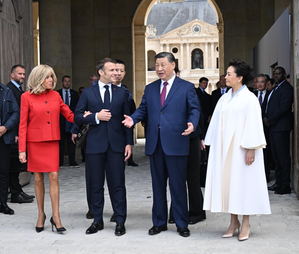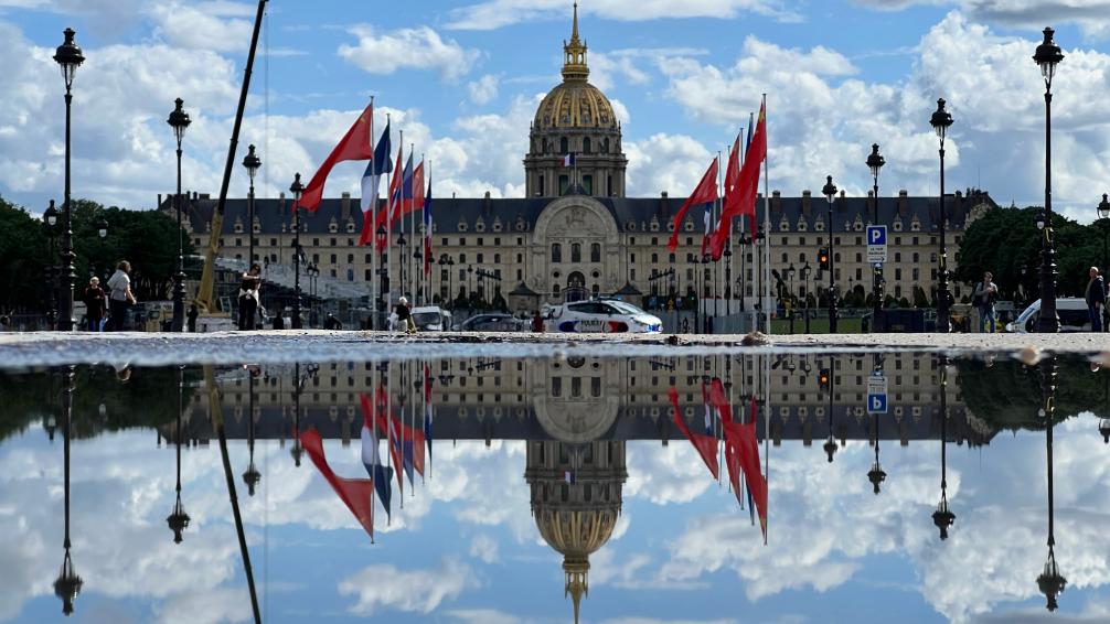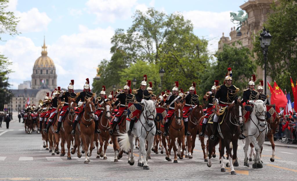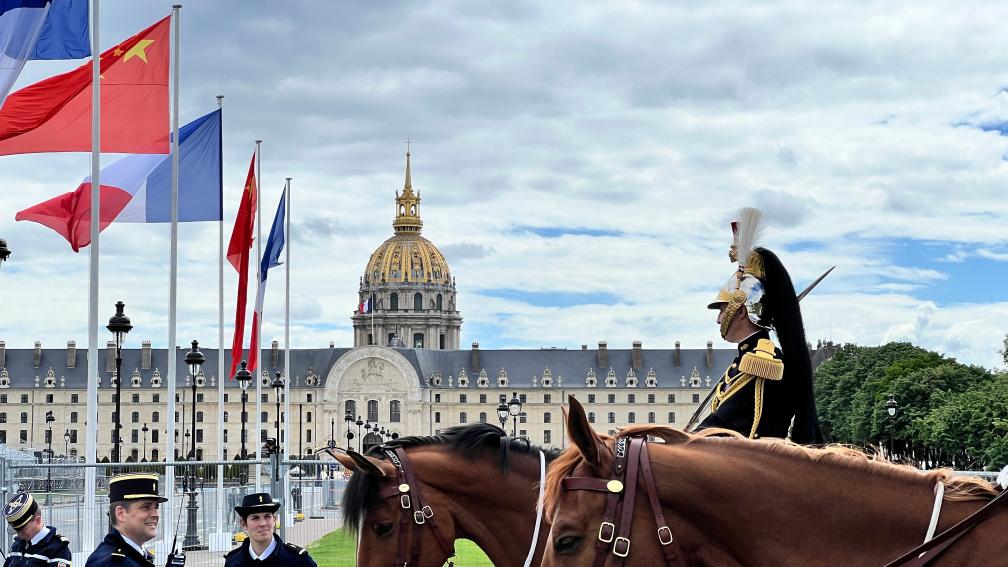 ??五月的巴黎,風和景明。塞納河畔,榮軍院金色穹頂熠熠生輝,五星紅旗和藍白紅三色旗迎風飄揚。