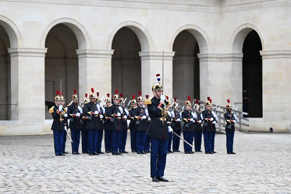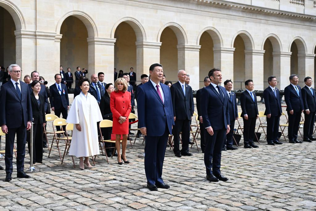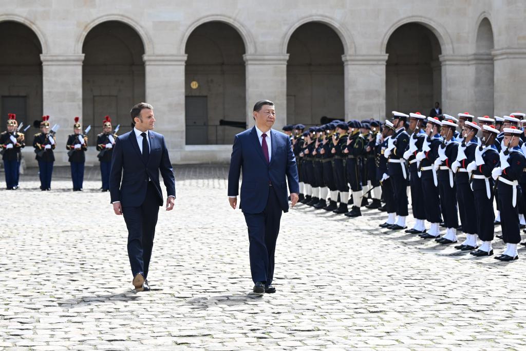 ??當天下午,習近平在巴黎出席馬克龍舉行的隆重盛大歡迎儀式。兩國元首檢閱法蘭西共和國衛隊和陸海空三軍儀仗隊,并觀看分列式。