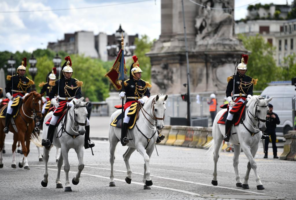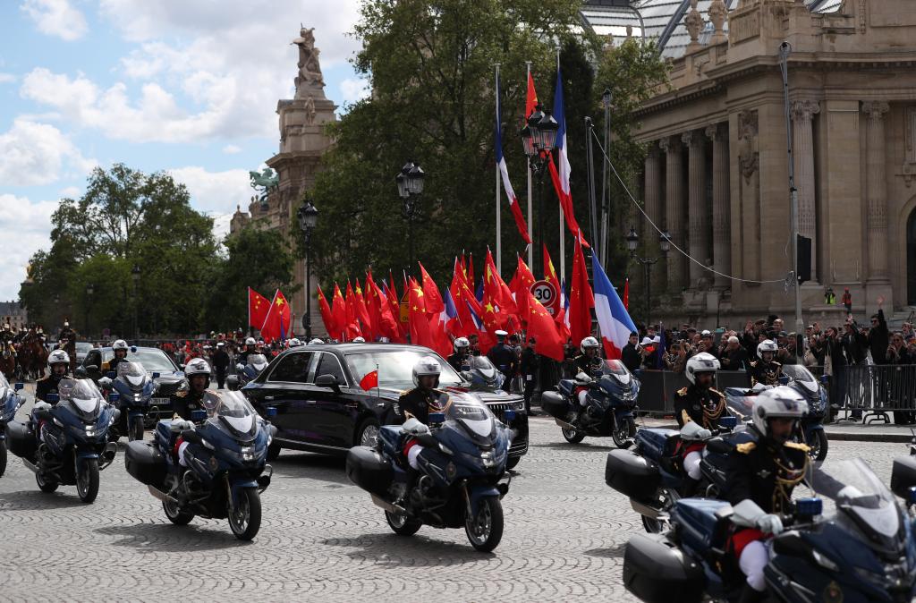 ??歡迎儀式后,習近平和夫人彭麗媛在共和國衛隊148名騎兵組成的禮兵馬隊和摩托車隊護衛下,乘車前往愛麗舍宮。