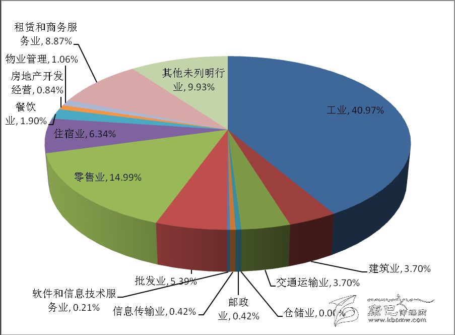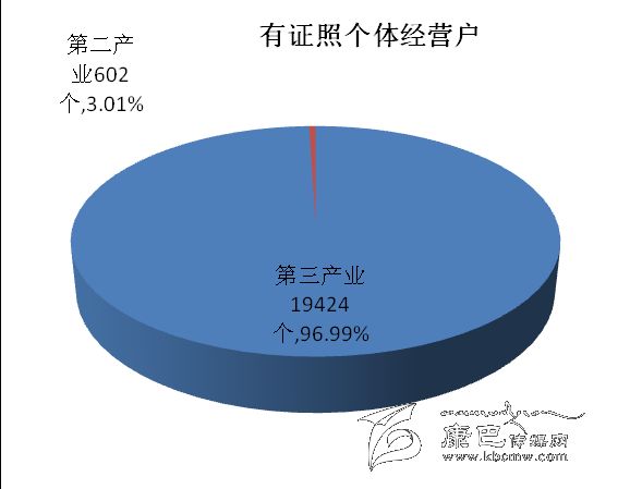 在有證照個體經營戶中,第二產業占3.01 %;第三產業占96.99 %。有證照個體經營戶從業人員中,第二產業占3.82 %,第三產業占96.18 %。