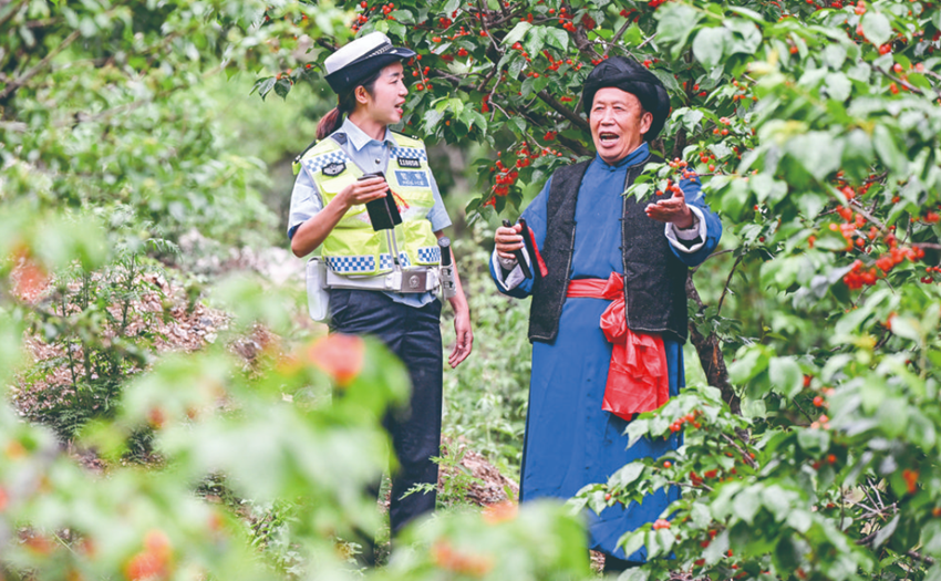 “所有開車駕駛員,自我告誡重三件。發(fā)動車輛開車前,重要部位查一遍。發(fā)動車輛開車前,排除隱患保安全。所有開車駕駛員,發(fā)動車輛開車前,系安全帶要規(guī)范。安全行駛最重要,平平安安回家園。”2024年瀘定紅櫻桃采摘體驗季推薦會前夕,在果實累累的杵坭村櫻桃樹下,素有“微笑交警”之譽的劉格蘆同省級非物質(zhì)文化遺產(chǎn)——瀘定山歌傳承人吳全清老人,冒著細雨一道錄制《開車自我告誡重三件》快板說唱視頻,在“平安甘孜”公眾號上傳播。