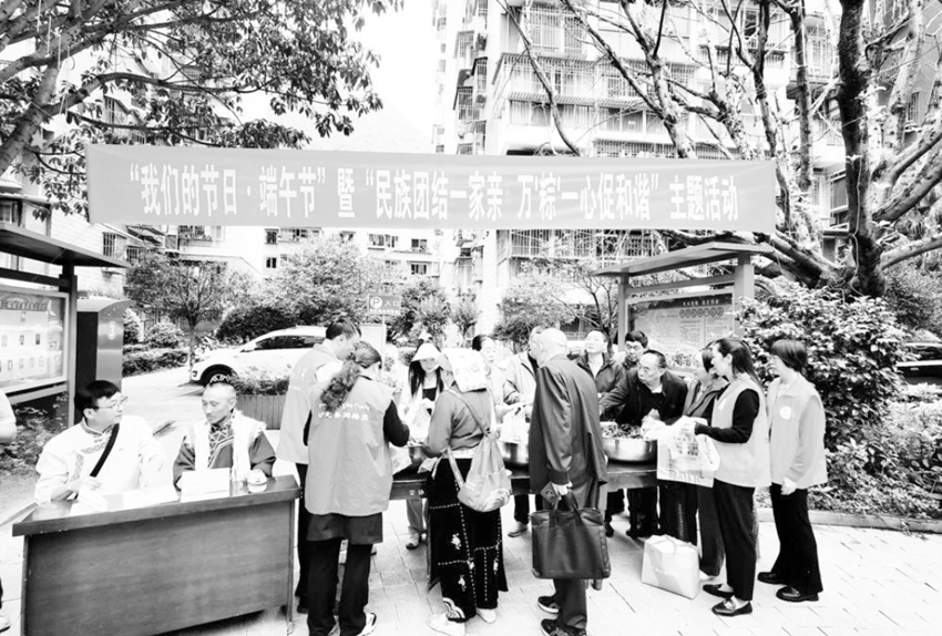在瀘定縣龍吟半島小區,衣著不同民族服飾的居民和小區志愿者們一大早就齊聚在小區內的甘孜縣駐瀘定老年活動中心“石榴籽工作室”,興致勃勃地準備一起包粽子。