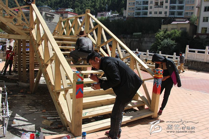 “在深秋艷陽的照射下,環山路木質棧道的長廊上圖案絢麗色調鮮明。現場有序地堆放著紅色的地磚和白色的木材。藏族畫匠在專心描摹,工人們的鋸子有節奏地發出聲音。在公主橋的施工現場,村民們有說有笑地忙著平路基,抬石頭、撮泥巴、砌墻。”這是近日筆者在康定文成環山路施工現場看到的熱鬧場面。