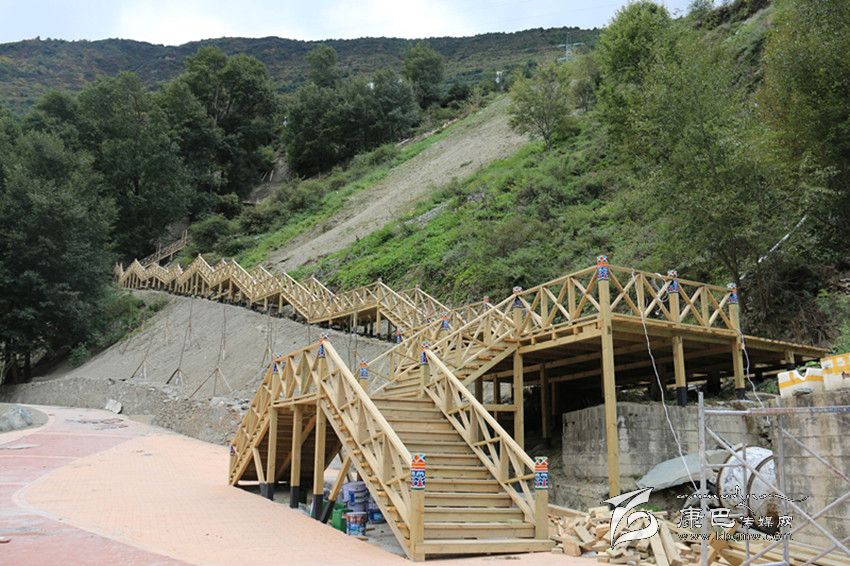 日前記者來到現場,實地體驗了在建中的爐巷·文成路。從甘孜日報社到公主橋,一路上河堤已經用漢白玉的石材建起了沿河欄桿,上面雕刻著吉祥八寶圖案。山路中還設計了一個較大的亭子,以這個亭子為中心,上通南無寺,下至將軍橋。一條藏式木制階梯長廊與白土坎村的阿里布果游道相連接,站在長廊的底端向上看階梯長廊,長廊就像一條在山間蜿蜒的巨龍,給爐巷·文成路添上了一抹神秘色彩。