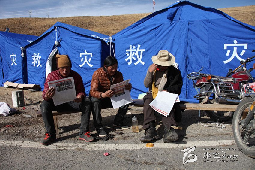 康定地震發生以來,前往災區采訪的記者堅持向災區群眾帶去《甘孜日報》藏漢文報,讓群眾在安置點就能了解黨委、政府組織抗震救災的情況。圖為江巴村民正在救災帳篷外看報。 李慶林 攝影報道