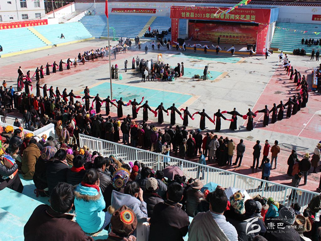 2月21日和22日,甘孜縣中心體育廣場彩旗獵獵,歌舞歡騰,由中共甘孜縣委、縣人民政府主辦,縣委宣傳部、縣文旅廣體局承辦的2015年新春民間文藝演出在這里隆重舉行,來自團結村和瓦巴村的藏族群眾穿上節日的盛裝,跳起歡快的鍋莊弦子,共慶新年。