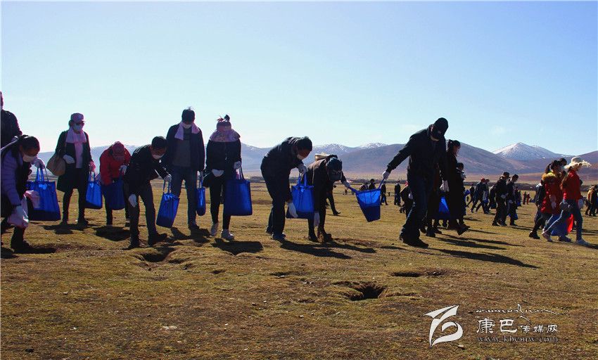 5月11日,距石渠縣城約5公里處的草原上人聲鼎沸,格外熱鬧。一大早,來自各單位的300余名黨員干部便聚集到了這里,身穿紅背心的青年志愿者們正忙著為大家分發口罩、手套等勞動物品。而在人群最前端,一輛拖拉機滿載著一車類似飼料的東西,七八個人正有條不紊地將“飼料”卸車并分裝進數百個藍色環保袋中。