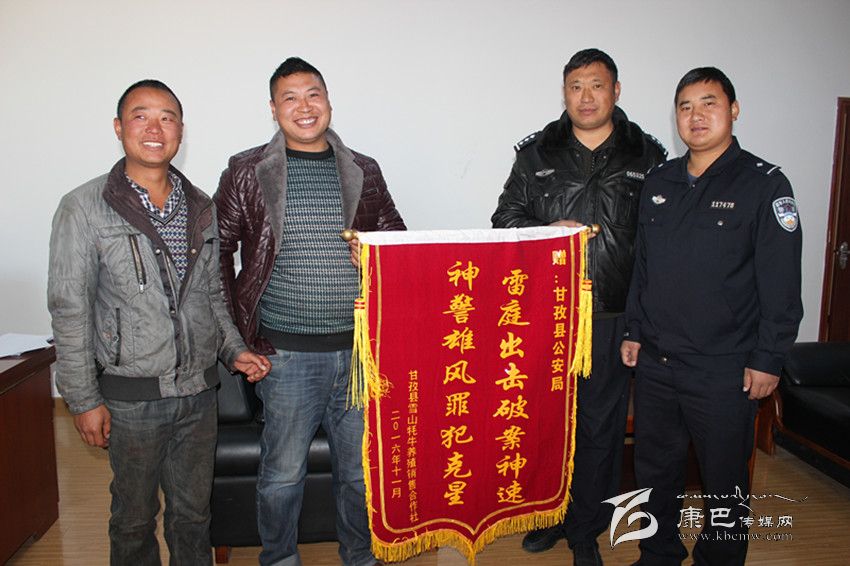 本網訊(余應瓊 文/圖)11月11日,甘孜縣雪山牦牛養殖銷售合作社負責人鄭萬強將一面繡有“雷霆出擊破案神速 神警雄風罪犯克星”的錦旗送到縣公安局,表達對公安干警迅速破案,幫助貧困群眾挽回經濟損失的感激之情。