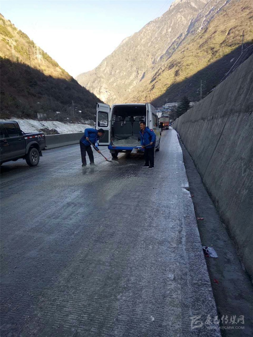 本網訊(李燕 本網記者 文/圖)近日,為有效減少和預防冬季雨雪冰凍惡劣天氣造成道路交通安全事故,康定翔瑞客運有限公司加大安全隱患排查,多措并舉確保道路通行安全。圖為公司工作人員在康定污水處理廠至菜園子段鋪墊防滑沙。