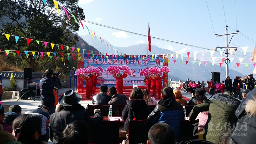 鼓聲喧天、歌聲飛揚(yáng),現(xiàn)場到處洋溢著濃濃的節(jié)日氛圍。浩浩蕩蕩的隊(duì)伍也引來了不少村民和游客們的關(guān)注。特別是隊(duì)伍中幾個(gè)唱山歌的村民獨(dú)特的腔調(diào)和唱詞盡展和平村山歌的特色。和平村每到冬月以后,村民家家戶戶便開始?xì)⒛曦i,相互串門,吃年豬宴,這一習(xí)俗已傳承百年,在和平村村民的心中,年豬文化節(jié)是一個(gè)慶祝豐收的節(jié)日。上午十點(diǎn)半,游行隊(duì)伍來到了和平村村級活動(dòng)室,“豬王”被放在了舞臺(tái)中間,焚香祈福后,當(dāng)?shù)卮迕裼幂d歌載舞的方式共慶這一節(jié)日的成功舉辦。村民們自編自演的舞蹈《祖國您好》《喜慶臨門》《紅梅贊》,現(xiàn)場表演唱山歌打草鞋,每一支舞,每一首歌都傳遞著村民們對黨對祖國對新生活的無限熱愛。