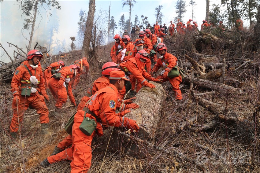 2月10日,甘孜森林支隊官兵合力清理倒木,防止林火蔓延。 (羅藝鑫 攝)