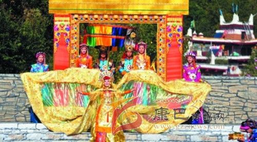 在催人奮進(jìn)的戰(zhàn)鼓聲中,一群身披甲胄的士兵拿著長(zhǎng)劍,背著巨弓走到臺(tái)前,在鏗鏘的戰(zhàn)鼓聲中,戰(zhàn)士們做著各種競(jìng)技動(dòng)作,模仿武士們互相攻擊的樣子,那矯健的身影展示了遠(yuǎn)古時(shí)代嘉絨藏族先民們?yōu)榱松媾c自然努力抗?fàn)幍膱?chǎng)景。過(guò)了一會(huì)兒音樂(lè)一轉(zhuǎn),戰(zhàn)鼓聲漸漸減弱,在鳥(niǎo)雀的陣陣啾啾聲中,一座木門(mén)慢慢的開(kāi)啟,一位身披長(zhǎng)袍、頭戴鳳冠的女王在眾多美女的簇?fù)硐拢従徸呦屡_(tái)階步入舞臺(tái)中央,此時(shí),一位手捧托盤(pán)的老者來(lái)到女王面前單膝下跪,將托盤(pán)高舉過(guò)頂,并邀請(qǐng)女王品嘗佳肴,女王將中指在酒中蘸了蘸,并曲起中指向四周輕輕彈去,寓意愿將杯中美酒與四方百姓同飲。在女王面前還放置著一個(gè)凈水桶,桶中盛滿了清澈的甘泉,桶上橫放著一枝柏樹(shù)枝,女王伸出纖纖玉手,拿著柏樹(shù)枝在水中蘸了蘸,面向墨爾多神山撒去,寓意向神山祈福。這是此次《美人谷·丹巴》節(jié)目展演中的序曲部分,有著強(qiáng)烈的東女神韻,將遠(yuǎn)古時(shí)代東女國(guó)女王遺風(fēng)展演的淋漓盡致。