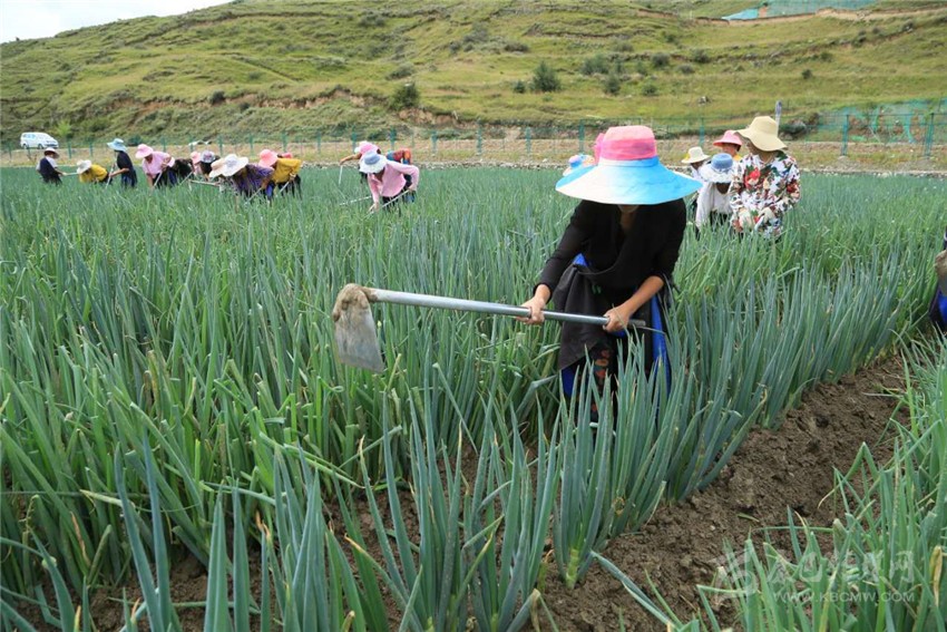 在麻孜鄉(xiāng)溝爾普村的大蔥種植示范基地,村民們正忙著給大蔥除草。