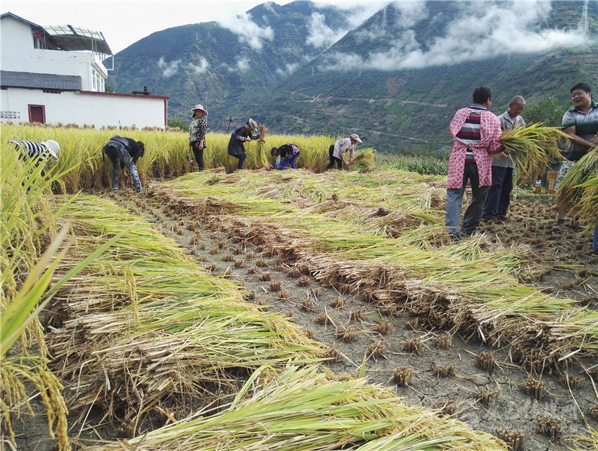 本網訊(縣委中心報道組 羅楚凱 文/圖)金秋時節,稻谷飄香。9月27日,瀘定縣德威鄉榿木林村吳代瓊在十幾個村民的幫助下正在田間收割水稻,農田里一片繁忙景象。據了解,今年瀘定縣水稻種植面積1000余畝,產量預計130多萬斤。