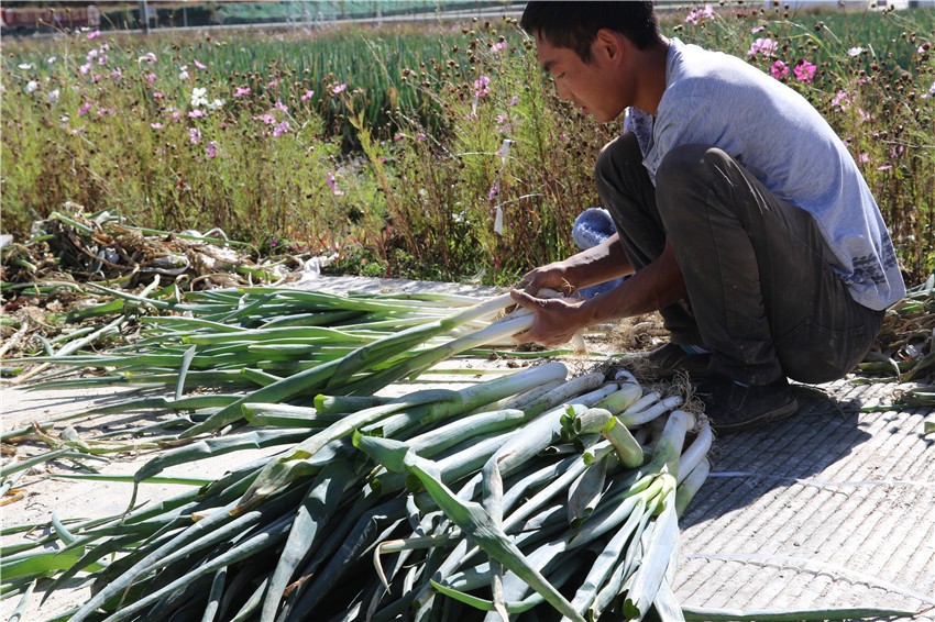 “我們家2畝土地年初就以630元/畝流轉(zhuǎn)給志華農(nóng)場(chǎng)了,平時(shí)我在基地打工每天有150元的收入,老公也在縣城打工,這樣算起來(lái)今年增收了2萬(wàn)元,去年生病借的錢(qián)慢慢還清了……基地里面種蔥子和家里種是兩回事,基地里面有技術(shù)人員進(jìn)行專(zhuān)門(mén)的講解示范,然后我們自己慢慢到實(shí)地練習(xí)。”溝爾普村貧困戶充翁格美這樣說(shuō)。