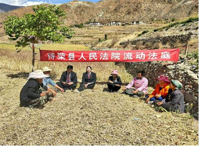 在曲雅貢鄉二號壩村進行法律宣講時,村民澤某請求法院判決其和丈夫扎某離婚,“流動法庭”法官立即在田間地頭組織調解。調解過程中當事人情緒抵觸、相互埋怨,尤其涉及到財產分割和子女撫養等問題時情緒波動大,場面一度僵持。法官憑借豐富的調解經驗,先從講解相關法律規定入手,告知當事人享有的權利義務,而后對離婚財產分割、子女撫養問題從情理法多角度層層剖析,促使雙方達成和解協議,有效化解了矛盾。“流動法庭”以宣促調、以案說法,達到了審理一案、教育一片、穩定一方的效果。