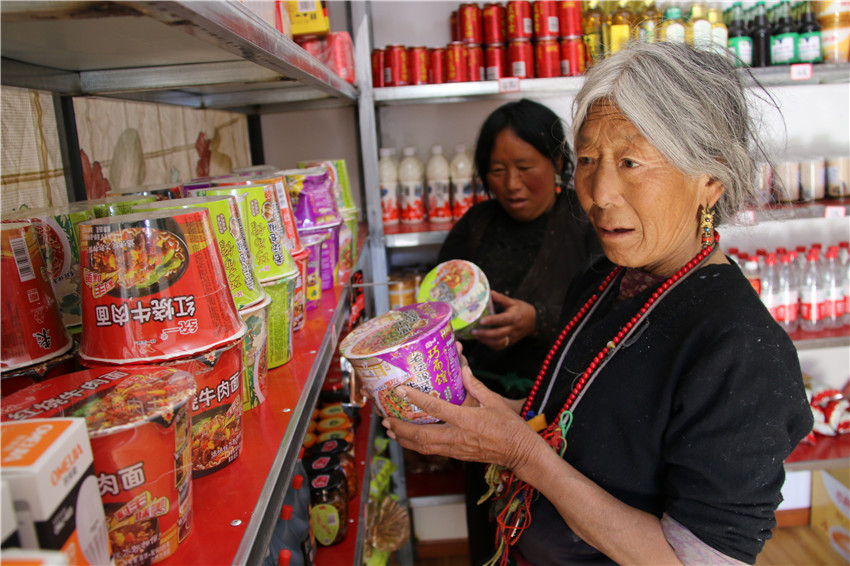 貨架上的貨物琳瑯滿目,價格與縣城大超市一分不差,還節省了路途奔波。“家門口就能買到東西,還又好又便宜,安逸。開展精準扶貧,硬是為大家解決了大困難。” 村民格瑪拉措道出了村民們的感激。大家共同商議決定把這超市叫做“洛蝦村感恩超市”。